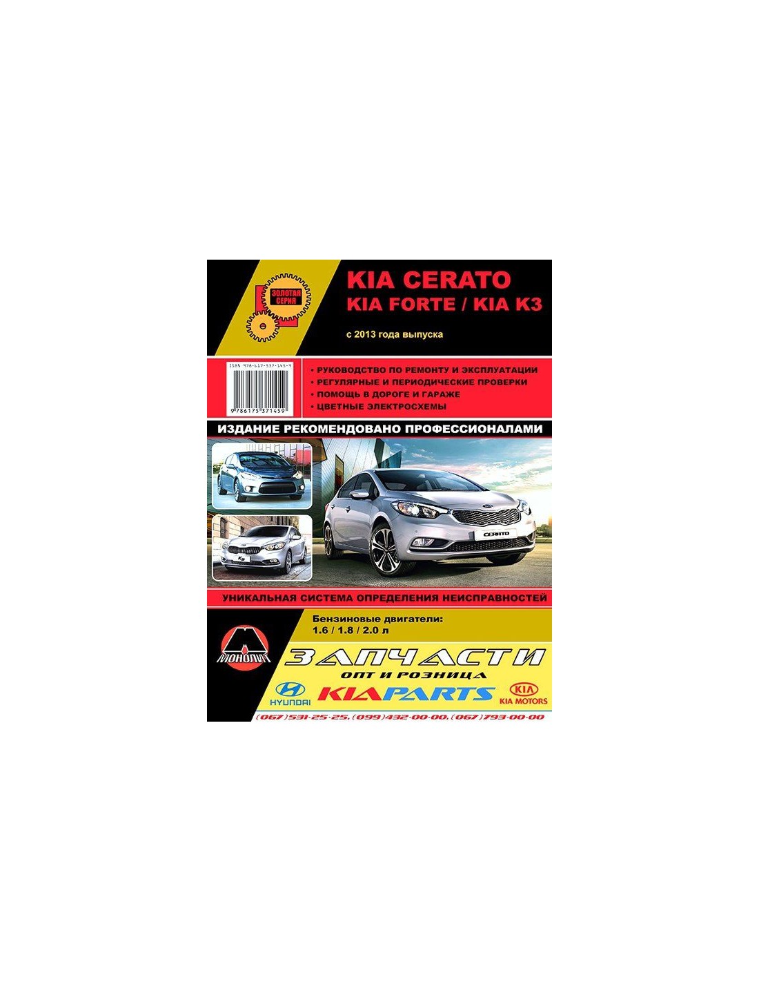 Устройство автомобиля,возможные неисправности и методы их устранения, сопрягаемые размеры основных деталей и пределы их допустимого износа,рекомендуемое смазочные материалы,рабочие жидкости и каталожные номера расходных запчастей,необходимых для технического обслуживания,размеры рекомендуемых и допускаемых шин и дисков-все это можно найти на страницах издания "Монолит" Книга автомобильная на KIA Cerato/ Forte/K3 (с 2013)