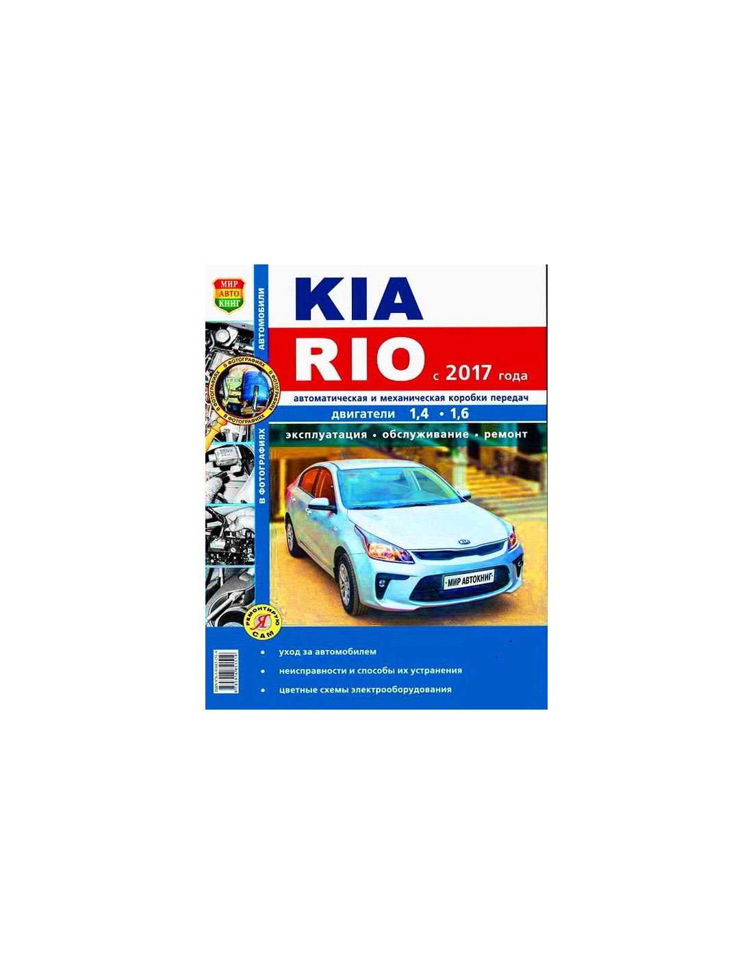 Книга по ремонту Kia Rio с 2017 г. ,содержит руководство по эксплуатации,общие сведения об устройстве автомобиля,рекомендации по техническому обслуживанию автомобиля,диагностике ремонту и регулировке элементов систем двигателя,систему смазки и охлаждения,запуска и зарядки,элементов механических и автоматических коробок передач,тормозной системы,включая антиблокировочную систему тормозов,рулевого управления,подвески,кузовных элементов, систем кондиционирования и вентиляции.