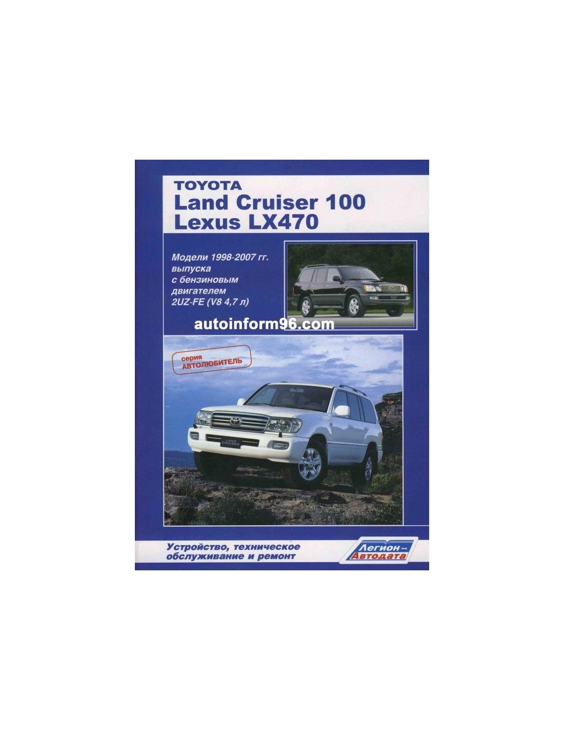 Книга по ремонту Toyota LandCruiser 100 & Lexus LX470 1998-07 г.,содержит руководство по эксплуатации,подробные сведения по техническому обслуживанию автомобиля,диагностике ремонту и регулировке элементов систем двигателя,в том числе электронного управления двигателем,систему смазки и охлаждения,запуска и зарядки,элементов механических и автоматических коробок передач,раздаточной коробки,тормозной системы,включая антиблокировочную систему тормозов,рулевого управления,подвески,кузовных элементов, систем кондиционирования и вентиляции.