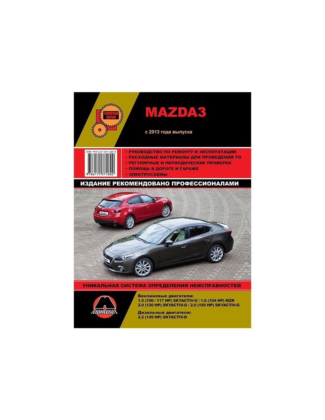 Книга по ремонту Mazda 3 с 2013 ,содержит руководство по эксплуатации,подробные сведения по техническому обслуживанию автомобиля,диагностике ремонту и регулировке элементов систем двигателя,в том числе электронного управления двигателем,систему смазки и охлаждения,запуска и зарядки,элементов механических и автоматических коробок передач,раздаточной коробки,тормозной системы,включая антиблокировочную систему тормозов,рулевого управления,подвески,кузовных элементов, систем кондиционирования и вентиляции.
