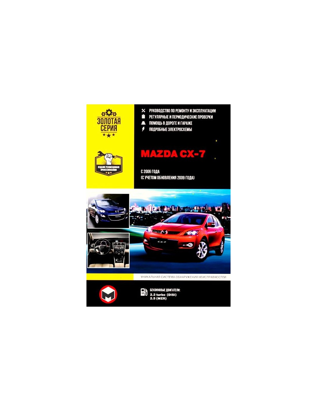 Книга по ремонту Mazda CX-7 с 2006г ,содержит руководство по эксплуатации,подробные сведения по техническому обслуживанию автомобиля,диагностике ремонту и регулировке элементов систем двигателя,в том числе электронного управления двигателем,систему смазки и охлаждения,запуска и зарядки,элементов механических и автоматических коробок передач,раздаточной коробки,тормозной системы,включая антиблокировочную систему тормозов,рулевого управления,подвески,кузовных элементов, систем кондиционирования и вентиляции.