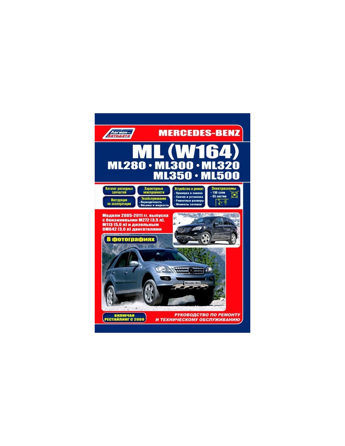 Книга по ремонту Mercedes-Benz ML280/300/320/350(W164) 2005-11 /рестайлинг. 2009 г.,содержит руководство по эксплуатации,подробные сведения по техническому обслуживанию автомобиля,диагностике ремонту и регулировке элементов систем двигателя,в том числе электронного управления двигателем,систему смазки и охлаждения,запуска и зарядки,элементов механических и автоматических коробок передач,раздаточной коробки,тормозной системы,включая антиблокировочную систему тормозов,рулевого управления,подвески,кузовных элементов, систем кондиционирования и вентиляции.