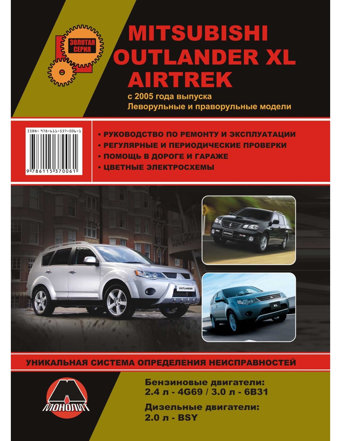 Книга по ремонту Mitsubishi Outlander XL/ Airtrek (лев ,содержит руководство по эксплуатации,подробные сведения по техническому обслуживанию автомобиля,диагностике ремонту и регулировке элементов систем двигателя,в том числе электронного управления двигателем,систему смазки и охлаждения,запуска и зарядки,элементов механических и автоматических коробок передач,раздаточной коробки,тормозной системы,включая антиблокировочную систему тормозов,рулевого управления,подвески,кузовных элементов, систем кондиционирования и вентиляции.