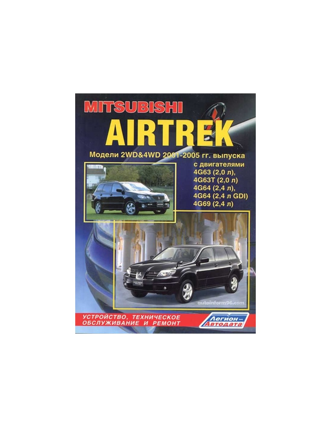 Книга по ремонту Mitsubishi Airtrek 2001-05 г.,содержит руководство по эксплуатации,подробные сведения по техническому обслуживанию автомобиля,диагностике ремонту и регулировке элементов систем двигателя,в том числе электронного управления двигателем,систему смазки и охлаждения,запуска и зарядки,элементов механических и автоматических коробок передач,раздаточной коробки,тормозной системы,включая антиблокировочную систему тормозов,рулевого управления,подвески,кузовных элементов, систем кондиционирования и вентиляции.