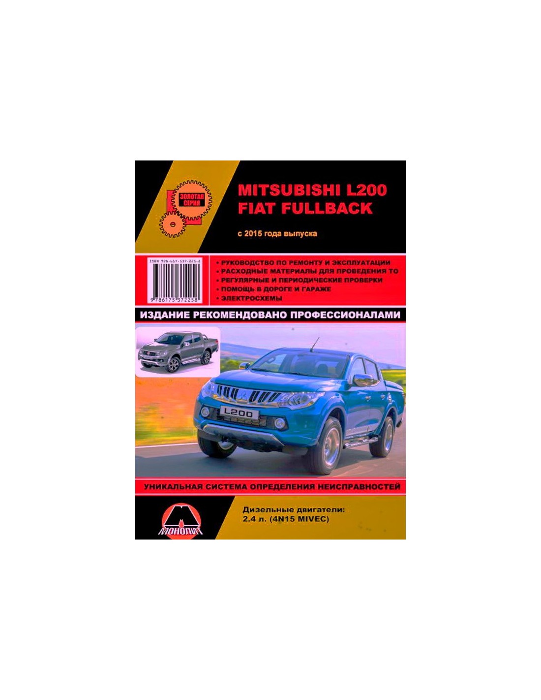 Книга по ремонту Mitsubishi L200 & FIAT Fullback с 2015 ,содержит руководство по эксплуатации,подробные сведения по техническому обслуживанию автомобиля,диагностике ремонту и регулировке элементов систем двигателя,в том числе электронного управления двигателем,систему смазки и охлаждения,запуска и зарядки,элементов механических и автоматических коробок передач,раздаточной коробки,тормозной системы,включая антиблокировочную систему тормозов,рулевого управления,подвески,кузовных элементов, систем кондиционирования и вентиляции.