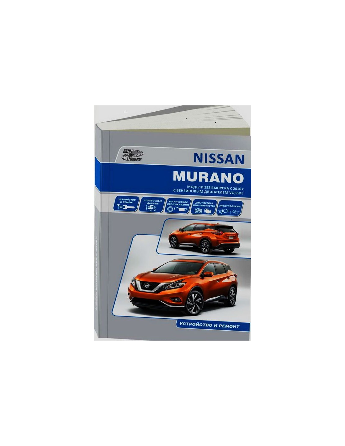 Устройство автомобиля,возможные неисправности и методы их устранения, сопрягаемые размеры основных деталей и пределы их допустимого износа,рекомендуемое смазочные материалы,рабочие жидкости и каталожные номера расходных запчастей,необходимых для технического обслуживания,размеры рекомендуемых и допускаемых шин и дисков-все это можно найти на страницах издания "Автонавигатор" Книга автомобильная на Nissan Murano модели Z52 с 2016 г
