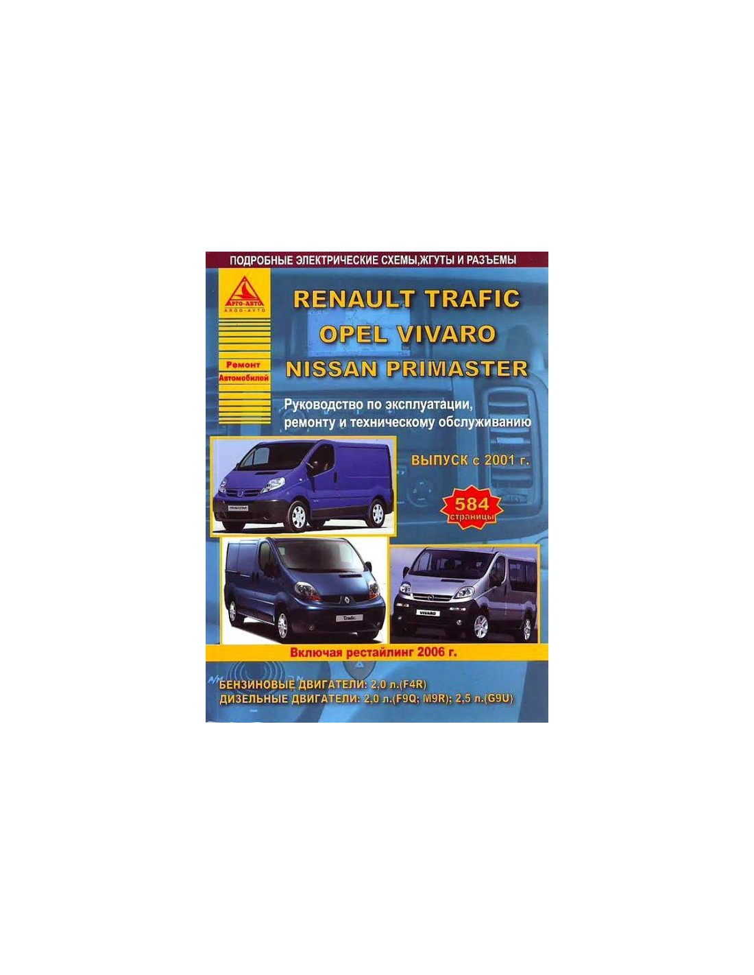 Книга по ремонту Renault Trafic & Nissan Primastar & Opel Vivaro c 2001 г. рестайл. с 2006 г.,содержит руководство по эксплуатации,подробные сведения по техническому обслуживанию автомобиля,систему смазки и охлаждения,запуска и зарядки,элементов механических и автоматических коробок передач,тормозной системы,включая антиблокировочную систему тормозов,рулевого управления,подвески,кузовных элементов, систем кондиционирования и вентиляции.