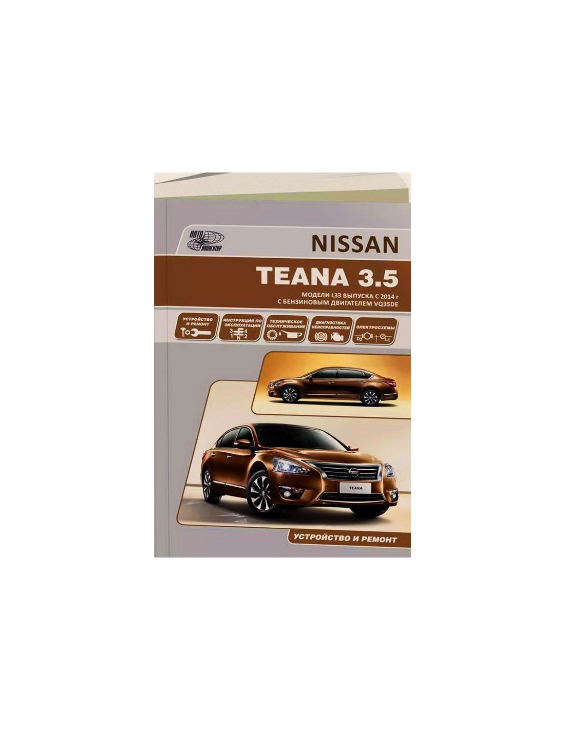 Устройство автомобиля,возможные неисправности и методы их устранения, сопрягаемые размеры основных деталей и пределы их допустимого износа,рекомендуемое смазочные материалы,рабочие жидкости и каталожные номера расходных запчастей,необходимых для технического обслуживания,размеры рекомендуемых и допускаемых шин и дисков-все это можно найти на страницах издания "Автонавигатор" Книга автомобильная на Nissan Teana с 2014 г