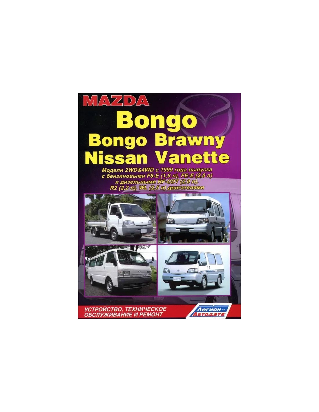 Книга по ремонту Mazda Bongo/Bongo Brawny & Nissan Vanette с 1999 г ,содержит руководство по эксплуатации,подробные сведения по техническому обслуживанию автомобиля,диагностике ремонту и регулировке элементов систем двигателя,в том числе электронного управления двигателем,систему смазки и охлаждения,запуска и зарядки,элементов механических и автоматических коробок передач,раздаточной коробки,тормозной системы,включая антиблокировочную систему тормозов,рулевого управления,подвески,кузовных элементов, систем кондиционирования и вентиляции.