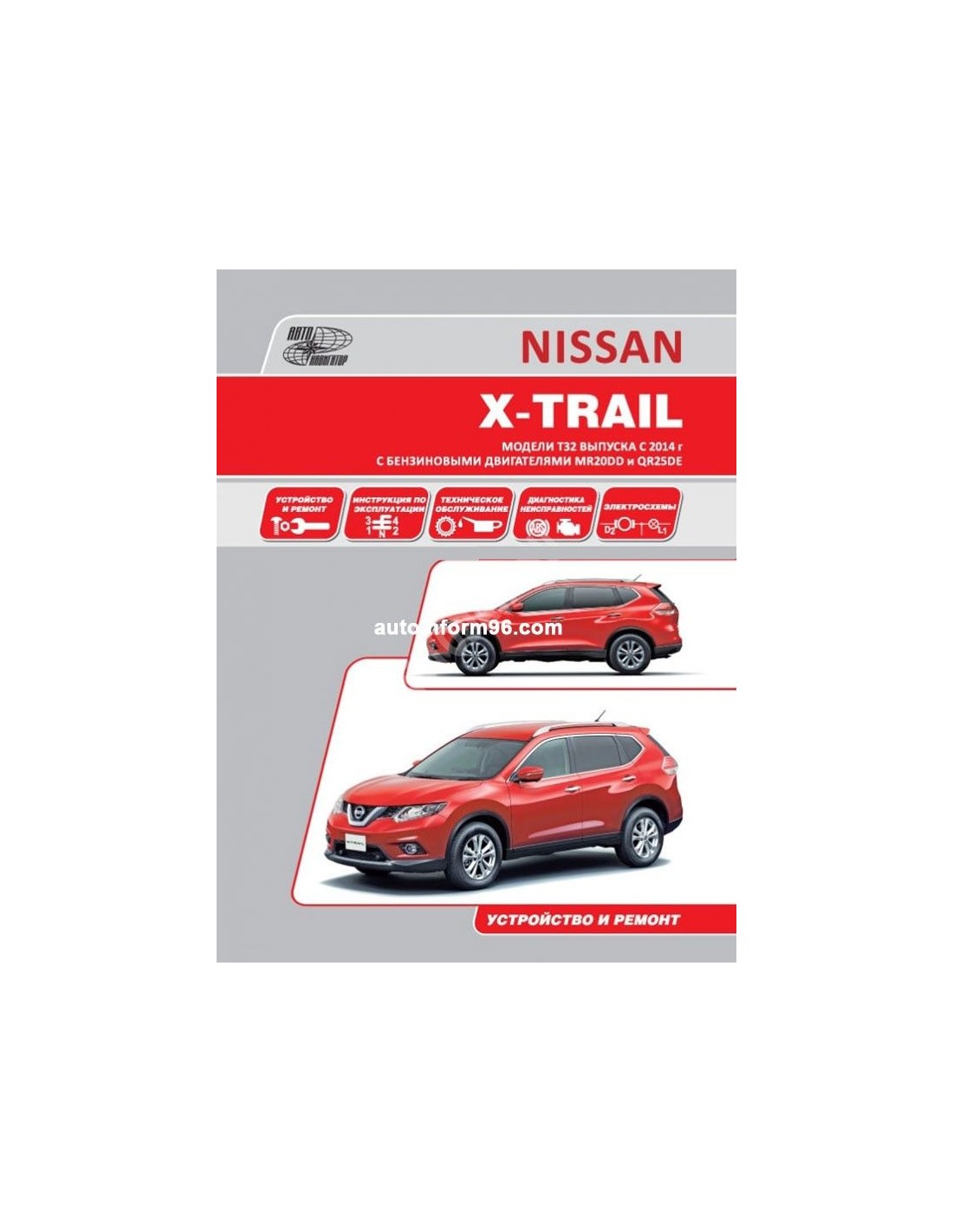 Книга по ремонту Nissan X-Trail T32 с 2014 г ,содержит руководство по эксплуатации,подробные сведения по техническому обслуживанию автомобиля,диагностике ремонту и регулировке элементов систем двигателя,в том числе электронного управления двигателем,систему смазки и охлаждения,запуска и зарядки,элементов механических и автоматических коробок передач,раздаточной коробки,тормозной системы,включая антиблокировочную систему тормозов,рулевого управления,подвески,кузовных элементов, систем кондиционирования и вентиляции.