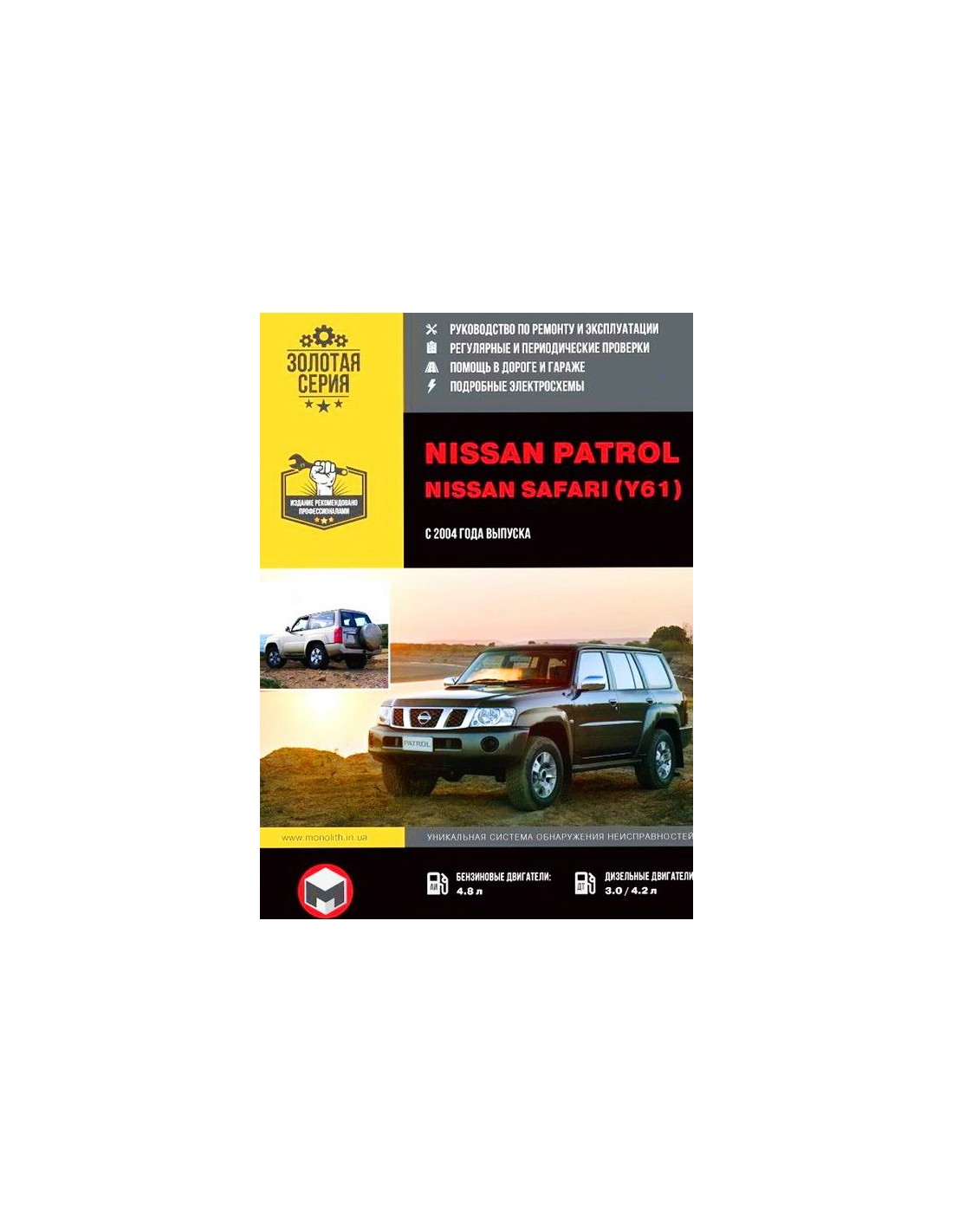 Книга по ремонту Nissan Patrol/Safari (Y61) c 2004 г ,содержит руководство по эксплуатации,подробные сведения по техническому обслуживанию автомобиля,диагностике ремонту и регулировке элементов систем двигателя,в том числе электронного управления двигателем,систему смазки и охлаждения,запуска и зарядки,элементов механических и автоматических коробок передач,раздаточной коробки,тормозной системы,включая антиблокировочную систему тормозов,рулевого управления,подвески,кузовных элементов, систем кондиционирования и вентиляции.