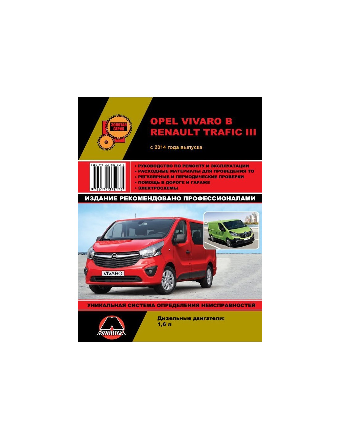 Книга по ремонту Opel Vivaro / Renault Trafic с 2014 ,содержит руководство по эксплуатации,подробные сведения по техническому обслуживанию автомобиля,диагностике ремонту и регулировке элементов систем двигателя,в том числе электронного управления двигателем,систему смазки и охлаждения,запуска и зарядки,элементов механических и автоматических коробок передач,раздаточной коробки,тормозной системы,включая антиблокировочную систему тормозов,рулевого управления,подвески,кузовных элементов, систем кондиционирования и вентиляции.
