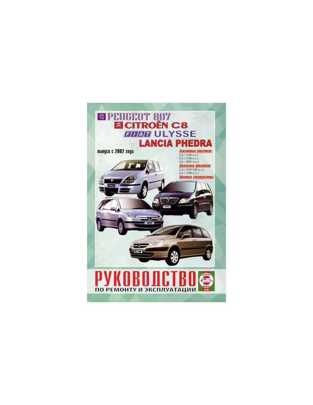 Книга по ремонту Pegeot 807, Citroen C8, Fiat Ulysse, Lancia Phedra с 2002 г. ,содержит руководство по эксплуатации,подробные сведения по техническому обслуживанию автомобиля,систему смазки и охлаждения,запуска и зарядки,элементов механических и автоматических коробок передач,тормозной системы,включая антиблокировочную систему тормозов,рулевого управления,подвески,кузовных элементов, систем кондиционирования и вентиляции.
