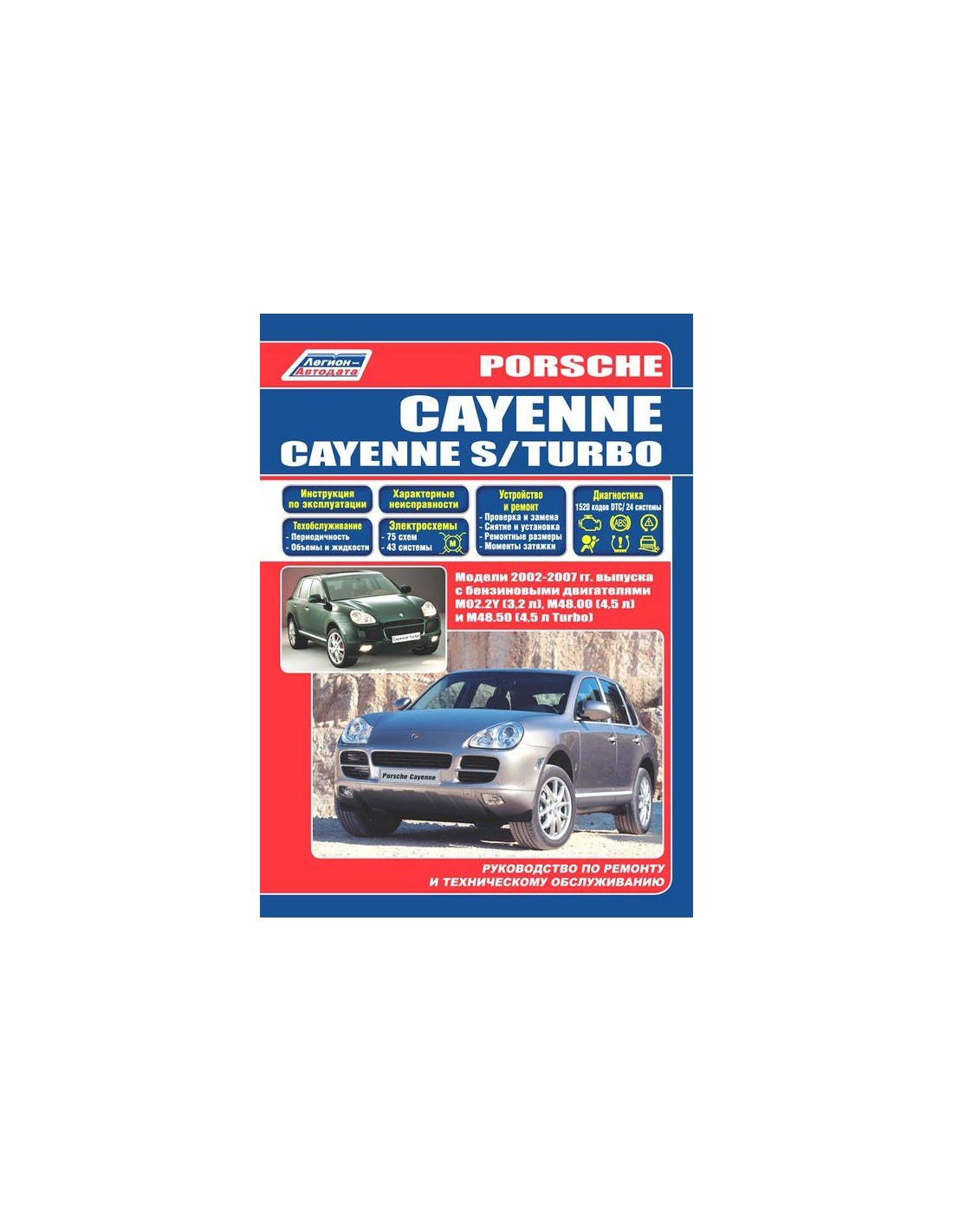 Книга по ремонту Porsche Cayenne/Cayenne S/Turbo 2002-07 г.,содержит руководство по эксплуатации,подробные сведения по техническому обслуживанию автомобиля,диагностике ремонту и регулировке элементов систем двигателя,в том числе электронного управления двигателем,систему смазки и охлаждения,запуска и зарядки,элементов механических и автоматических коробок передач,раздаточной коробки,тормозной системы,включая антиблокировочную систему тормозов,рулевого управления,подвески,кузовных элементов, систем кондиционирования и вентиляции.