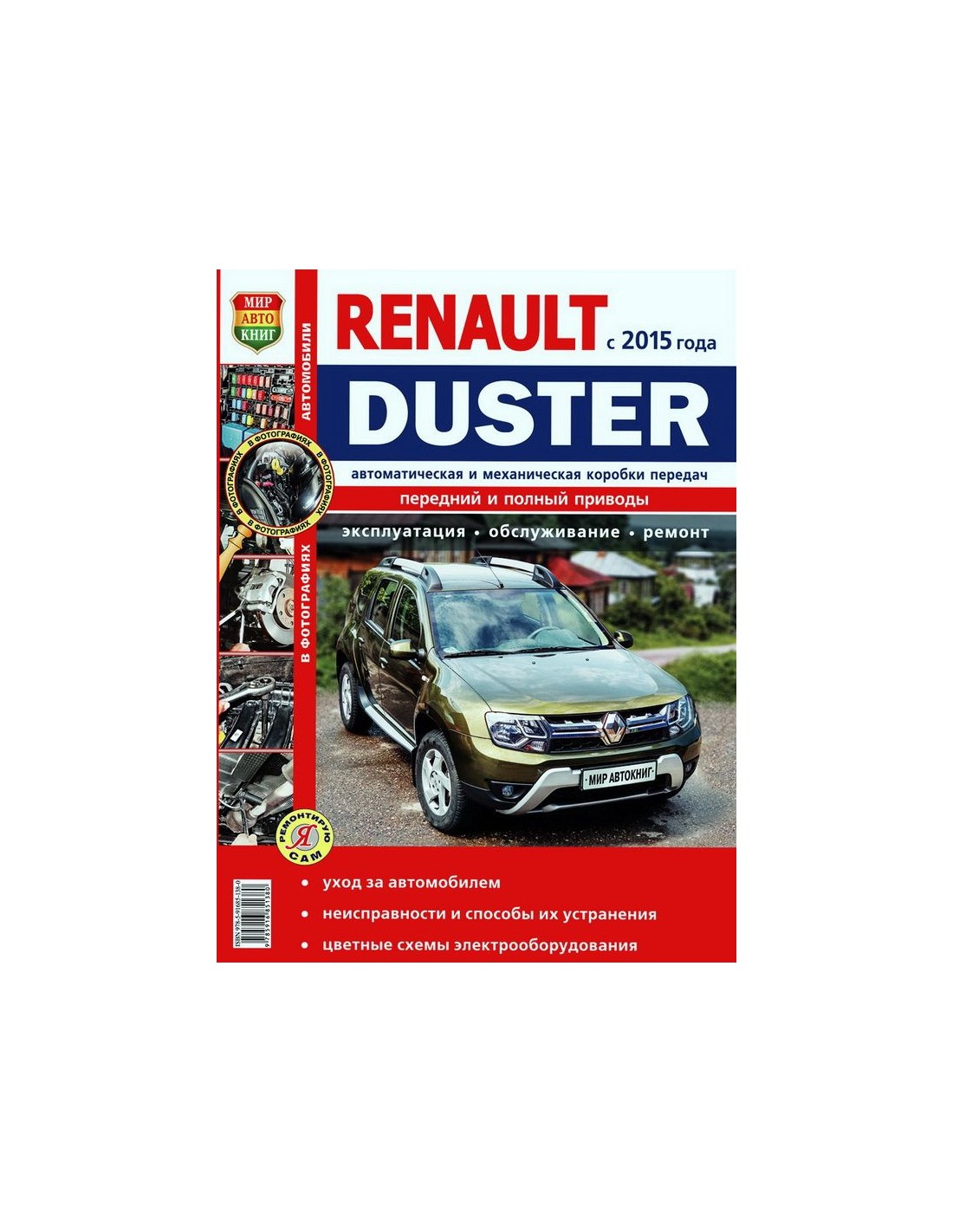 Книга по ремонту Renault Duster рестайлинговые модели c 2015 г. ,содержит руководство по эксплуатации,общие сведения об устройстве автомобиля,рекомендации по техническому обслуживанию автомобиля,диагностике ремонту и регулировке элементов систем двигателя,систему смазки и охлаждения,запуска и зарядки,элементов механических и автоматических коробок передач,тормозной системы,включая антиблокировочную систему тормозов,рулевого управления,подвески,кузовных элементов, систем кондиционирования и вентиляции.