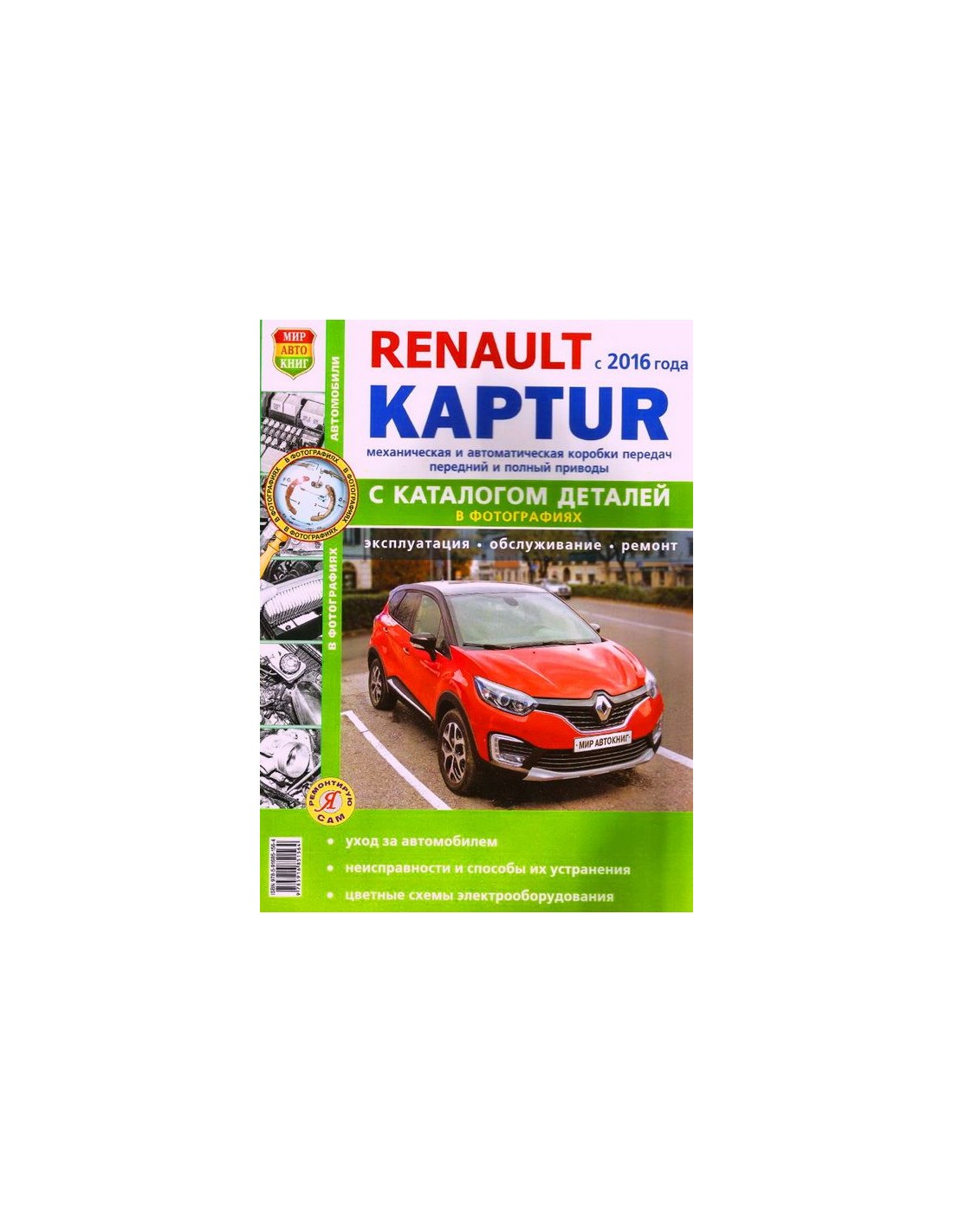 Книга по ремонту Renault Kaptur c 2016 г. (ч/б фото+Каталог деталей). ,содержит руководство по эксплуатации,общие сведения об устройстве автомобиля,рекомендации по техническому обслуживанию автомобиля,диагностике ремонту и регулировке элементов систем двигателя,систему смазки и охлаждения,запуска и зарядки,элементов механических и автоматических коробок передач,тормозной системы,включая антиблокировочную систему тормозов,рулевого управления,подвески,кузовных элементов, систем кондиционирования и вентиляции.