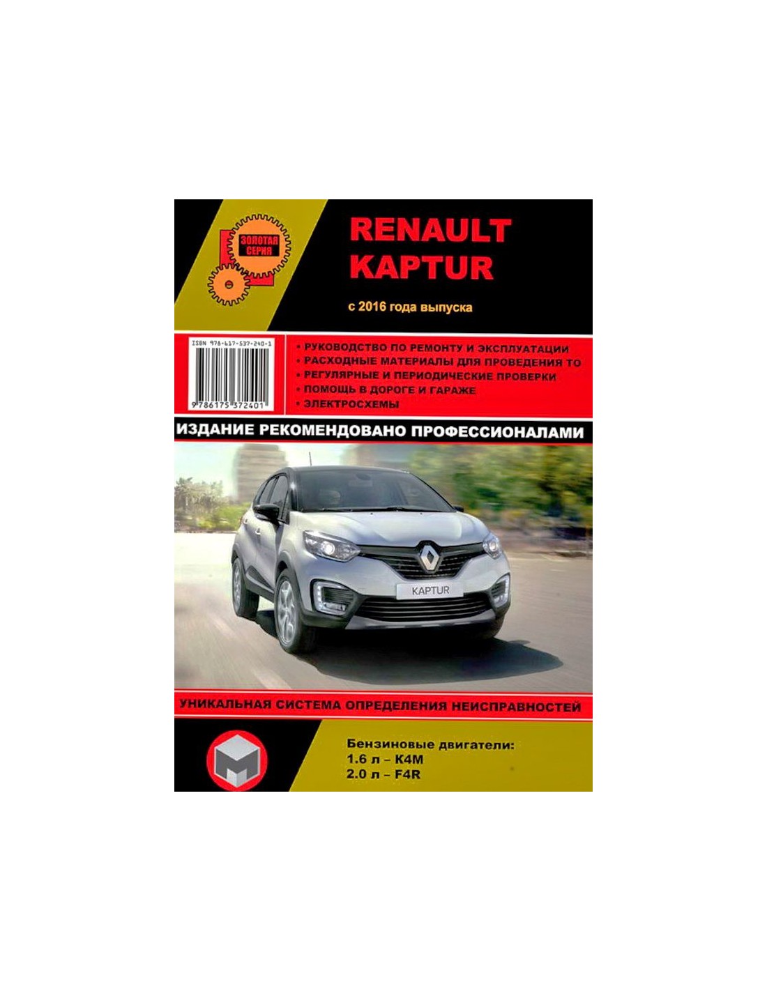 Книга по ремонту Renault Kaptur с 2016 ,содержит руководство по эксплуатации,подробные сведения по техническому обслуживанию автомобиля,диагностике ремонту и регулировке элементов систем двигателя,в том числе электронного управления двигателем,систему смазки и охлаждения,запуска и зарядки,элементов механических и автоматических коробок передач,раздаточной коробки,тормозной системы,включая антиблокировочную систему тормозов,рулевого управления,подвески,кузовных элементов, систем кондиционирования и вентиляции.