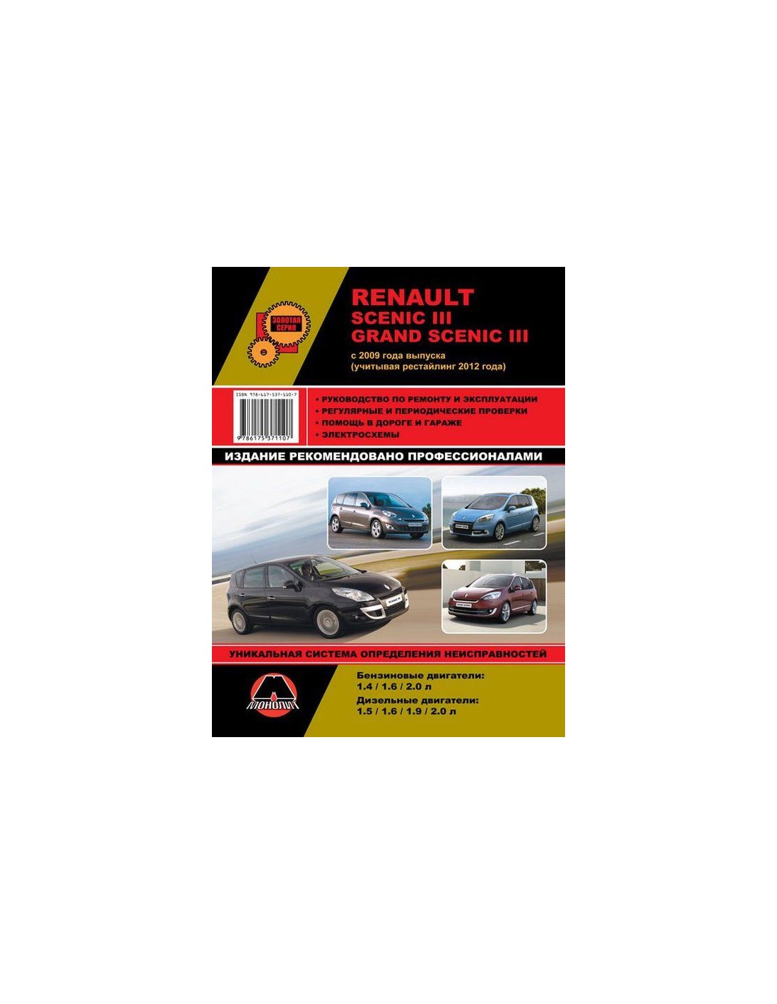 Книга по ремонту Renault Scenic III / Grand Scenic III (с 2009, рестайлинг с 2012) ,содержит руководство по эксплуатации,подробные сведения по техническому обслуживанию автомобиля,диагностике ремонту и регулировке элементов систем двигателя,в том числе электронного управления двигателем,систему смазки и охлаждения,запуска и зарядки,элементов механических и автоматических коробок передач,раздаточной коробки,тормозной системы,включая антиблокировочную систему тормозов,рулевого управления,подвески,кузовных элементов, систем кондиционирования и вентиляции.