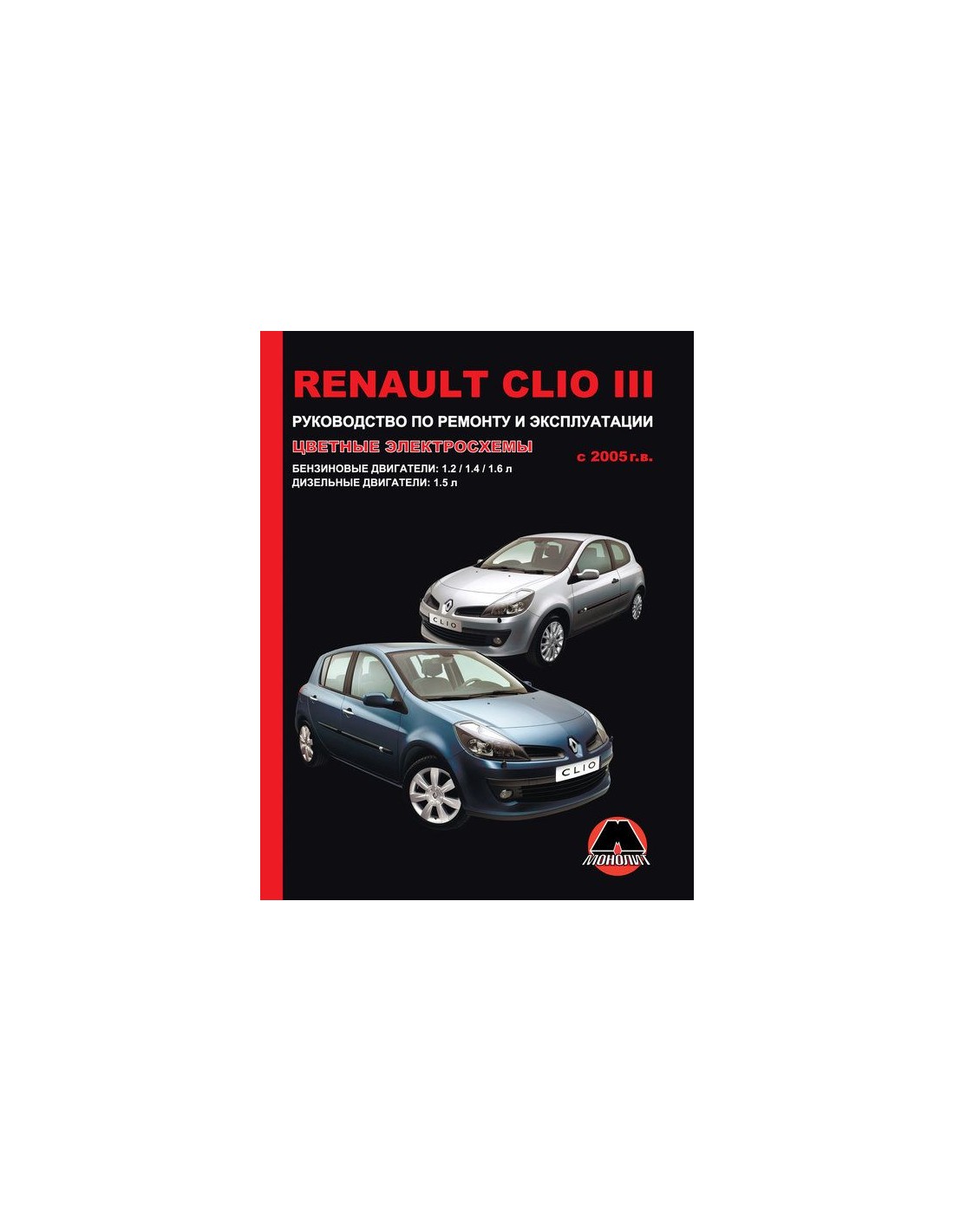 Книга по ремонту Renault Clio III c 2005 г ,содержит руководство по эксплуатации,подробные сведения по техническому обслуживанию автомобиля,диагностике ремонту и регулировке элементов систем двигателя,в том числе электронного управления двигателем,систему смазки и охлаждения,запуска и зарядки,элементов механических и автоматических коробок передач,раздаточной коробки,тормозной системы,включая антиблокировочную систему тормозов,рулевого управления,подвески,кузовных элементов, систем кондиционирования и вентиляции.