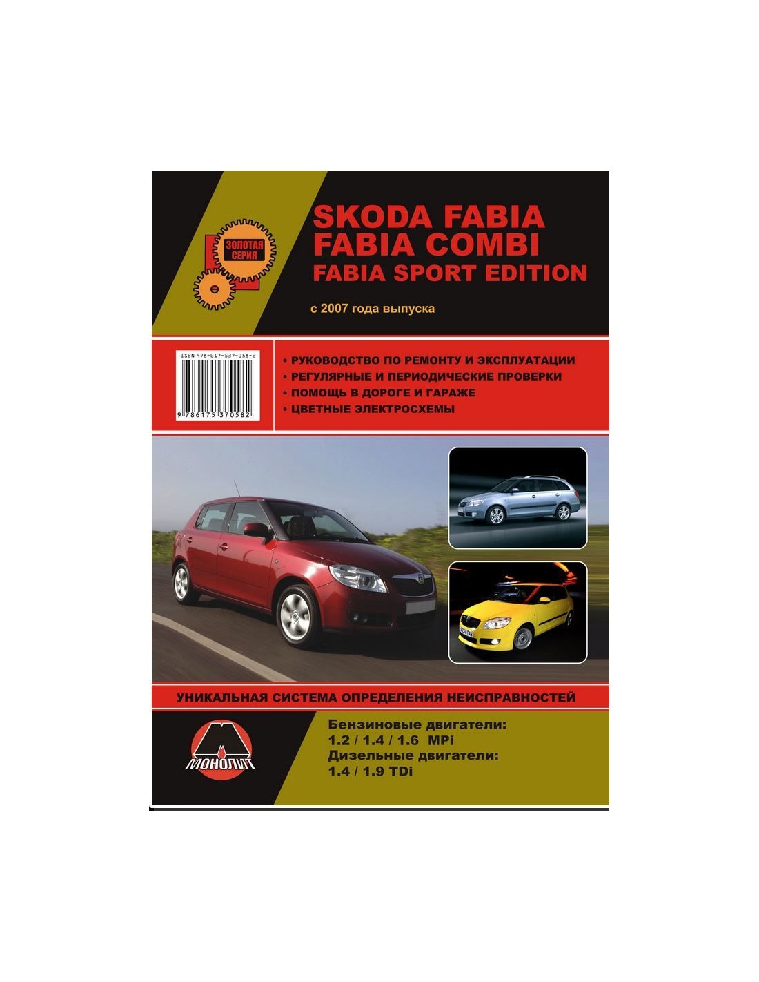 Книга по ремонту Skoda Fabia / Fabia Combi Fabia Sport Edition с 2007 г ,содержит руководство по эксплуатации,подробные сведения по техническому обслуживанию автомобиля,диагностике ремонту и регулировке элементов систем двигателя,в том числе электронного управления двигателем,систему смазки и охлаждения,запуска и зарядки,элементов механических и автоматических коробок передач,раздаточной коробки,тормозной системы,включая антиблокировочную систему тормозов,рулевого управления,подвески,кузовных элементов, систем кондиционирования и вентиляции.