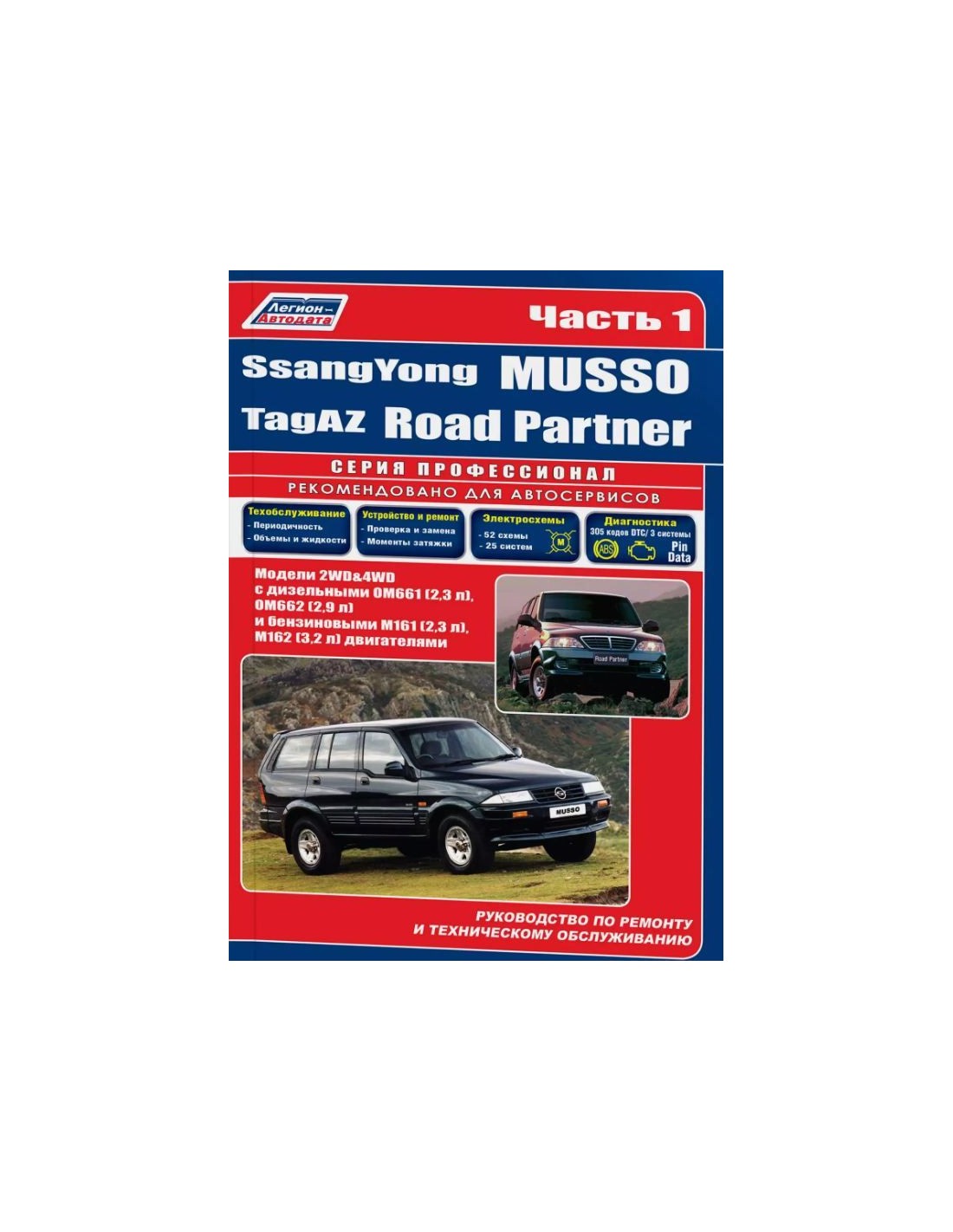 Книга по ремонту SsangYong Musso / TagAZ Road Partner (2 тома) вкл,содержит руководство по эксплуатации,подробные сведения по техническому обслуживанию автомобиля,диагностике ремонту и регулировке элементов систем двигателя,в том числе электронного управления двигателем,систему смазки и охлаждения,запуска и зарядки,элементов механических и автоматических коробок передач,раздаточной коробки,тормозной системы,включая антиблокировочную систему тормозов,рулевого управления,подвески,кузовных элементов, систем кондиционирования и вентиляции.