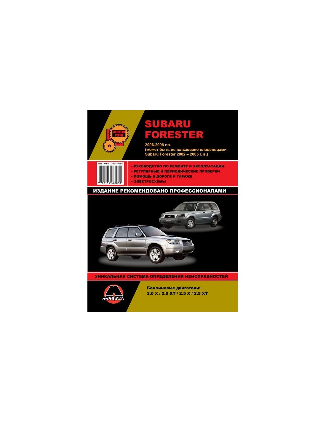 Книга по ремонту Subaru Forester с 2002-2008 г ,содержит руководство по эксплуатации,подробные сведения по техническому обслуживанию автомобиля,диагностике ремонту и регулировке элементов систем двигателя,в том числе электронного управления двигателем,систему смазки и охлаждения,запуска и зарядки,элементов механических и автоматических коробок передач,раздаточной коробки,тормозной системы,включая антиблокировочную систему тормозов,рулевого управления,подвески,кузовных элементов, систем кондиционирования и вентиляции.