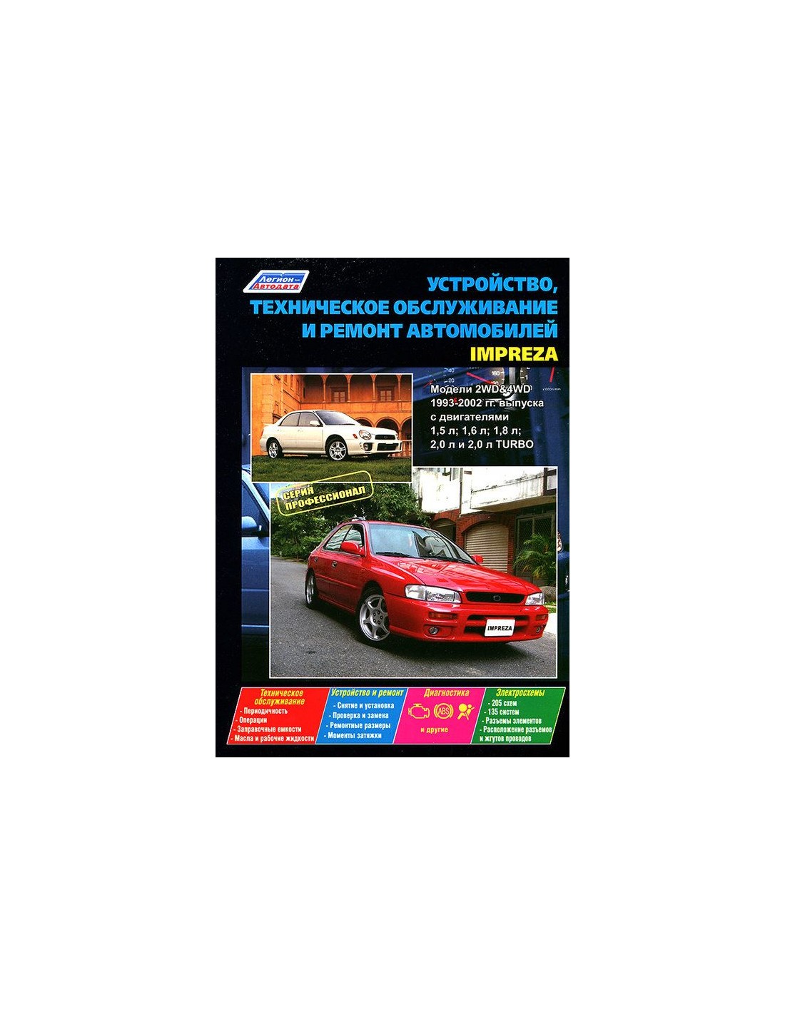 Устройство автомобиля,возможные неисправности и методы их устранения, сопрягаемые размеры основных деталей и пределы их допустимого износа,рекомендуемое смазочные материалы,рабочие жидкости и каталожные номера расходных запчастей,необходимых для технического обслуживания,размеры рекомендуемых и допускаемых шин и дисков-все это можно найти на страницах издания "Легион-Автодата" Книга автомобильная на Subaru Impreza 1993-02 г.