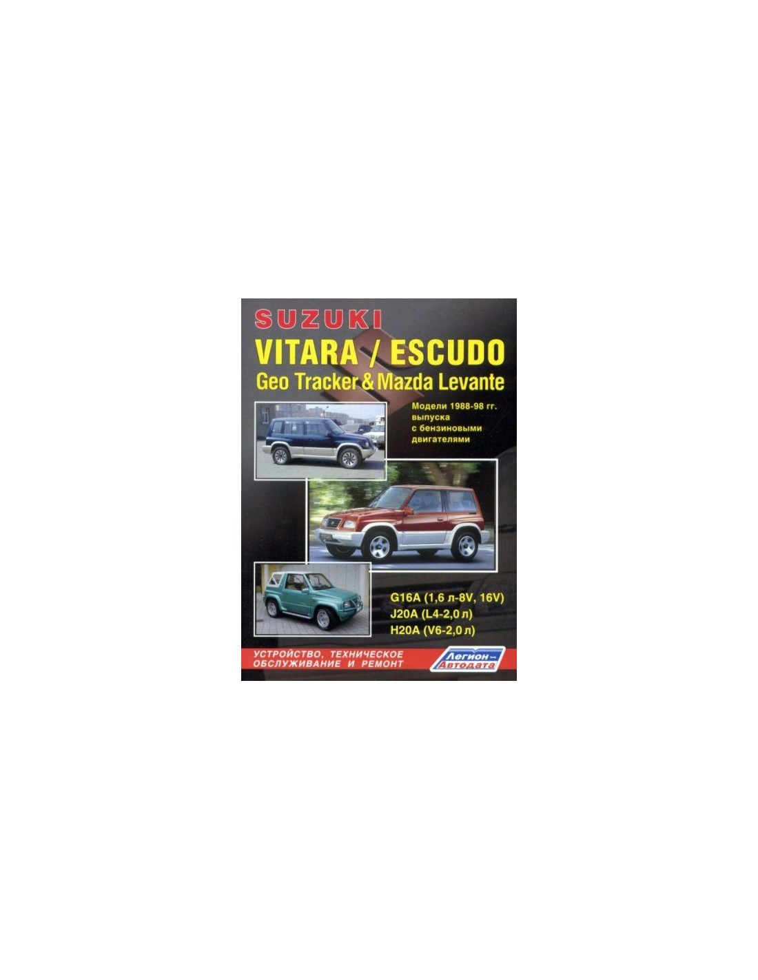 Книга по ремонту Suzuki VITARA/ESCUDO/Geo Tracker & Mazda Levante 1988-98 г.,содержит руководство по эксплуатации,подробные сведения по техническому обслуживанию автомобиля,диагностике ремонту и регулировке элементов систем двигателя,в том числе электронного управления двигателем,систему смазки и охлаждения,запуска и зарядки,элементов механических и автоматических коробок передач,раздаточной коробки,тормозной системы,включая антиблокировочную систему тормозов,рулевого управления,подвески,кузовных элементов, систем кондиционирования и вентиляции.