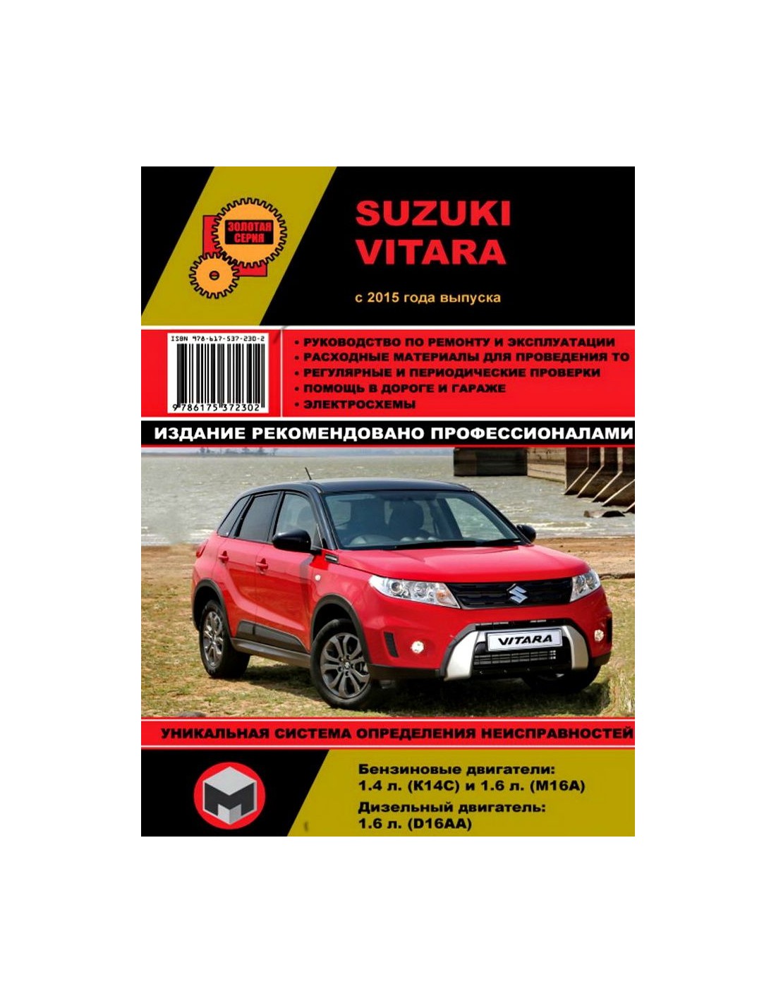 Книга по ремонту Suzuki Vitara (с 2015) ,содержит руководство по эксплуатации,подробные сведения по техническому обслуживанию автомобиля,диагностике ремонту и регулировке элементов систем двигателя,в том числе электронного управления двигателем,систему смазки и охлаждения,запуска и зарядки,элементов механических и автоматических коробок передач,раздаточной коробки,тормозной системы,включая антиблокировочную систему тормозов,рулевого управления,подвески,кузовных элементов, систем кондиционирования и вентиляции.