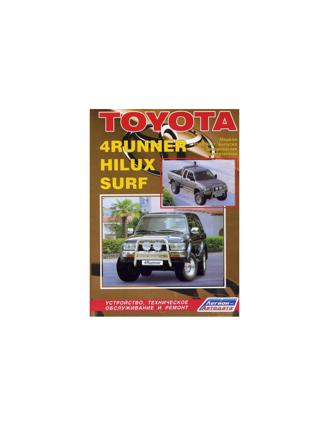 Книга по ремонту Toyota 4Runner/Hilux/Hilux Surf 1988-97 г.,содержит руководство по эксплуатации,подробные сведения по техническому обслуживанию автомобиля,диагностике ремонту и регулировке элементов систем двигателя,в том числе электронного управления двигателем,систему смазки и охлаждения,запуска и зарядки,элементов механических и автоматических коробок передач,раздаточной коробки,тормозной системы,включая антиблокировочную систему тормозов,рулевого управления,подвески,кузовных элементов, систем кондиционирования и вентиляции.
