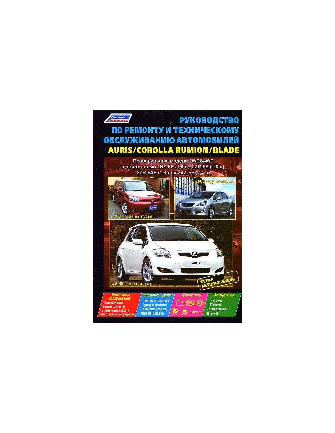 Устройство автомобиля,возможные неисправности и методы их устранения, сопрягаемые размеры основных деталей и пределы их допустимого износа,рекомендуемое смазочные материалы,рабочие жидкости и каталожные номера расходных запчастей,необходимых для технического обслуживания,размеры рекомендуемых и допускаемых шин и дисков-все это можно найти на страницах издания "Легион-Автодата" Книга автомобильная на Toyota Auris/Blade 2006-12 г.
