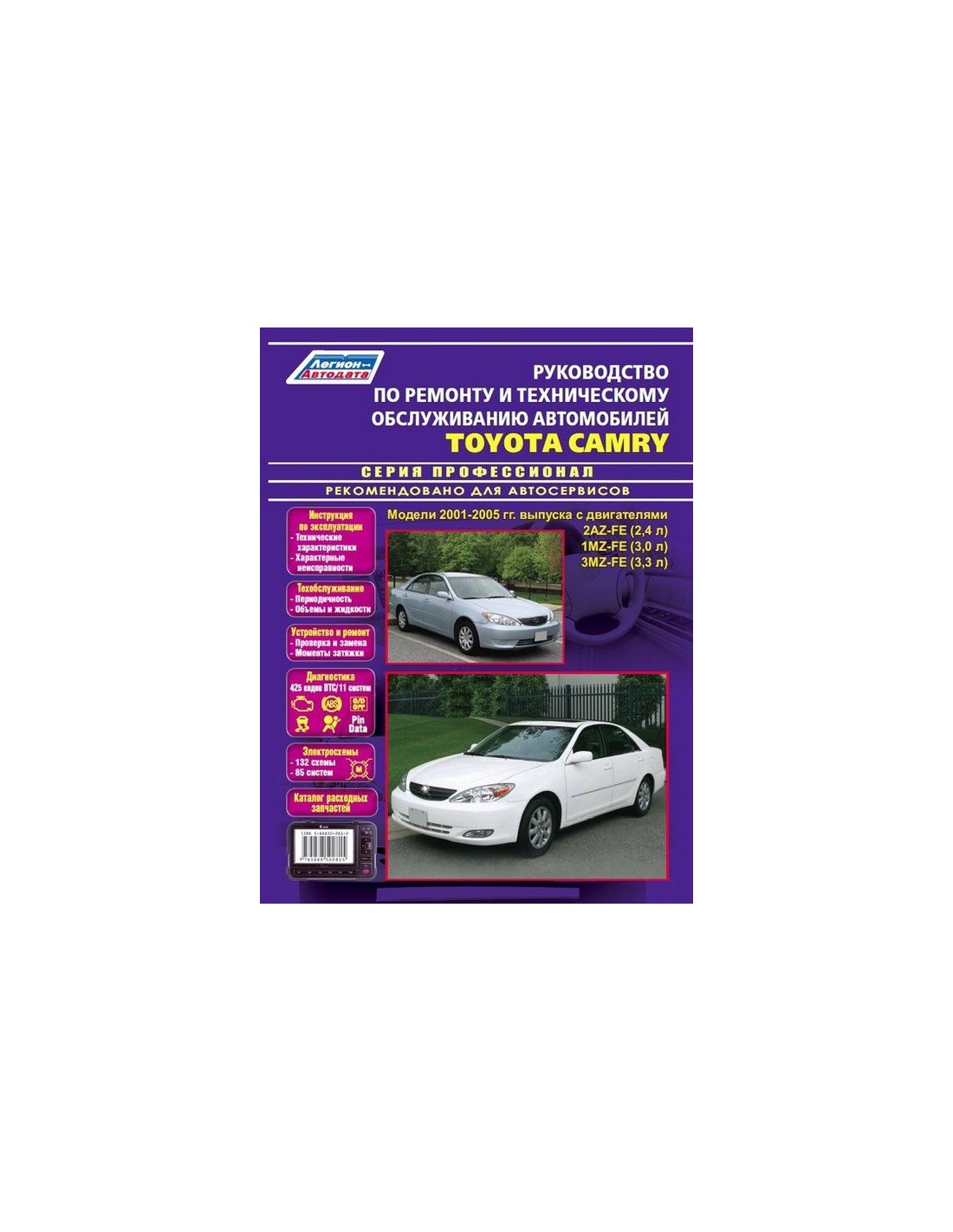 Устройство автомобиля,возможные неисправности и методы их устранения, сопрягаемые размеры основных деталей и пределы их допустимого износа,рекомендуемое смазочные материалы,рабочие жидкости и каталожные номера расходных запчастей,необходимых для технического обслуживания,размеры рекомендуемых и допускаемых шин и дисков-все это можно найти на страницах издания "Легион-Автодата" Книга автомобильная на Toyota Camry 2001-05 г.