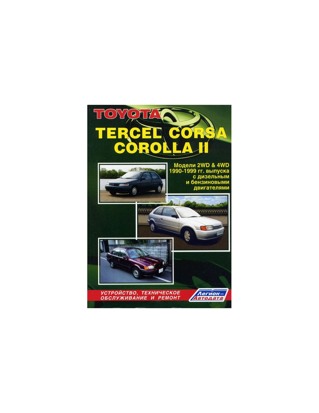 Книга по ремонту Toyota Tercel/Corsa/Corolla II 1990-99 г.,содержит руководство по эксплуатации,подробные сведения по техническому обслуживанию автомобиля,диагностике ремонту и регулировке элементов систем двигателя,в том числе электронного управления двигателем,систему смазки и охлаждения,запуска и зарядки,элементов механических и автоматических коробок передач,раздаточной коробки,тормозной системы,включая антиблокировочную систему тормозов,рулевого управления,подвески,кузовных элементов, систем кондиционирования и вентиляции.