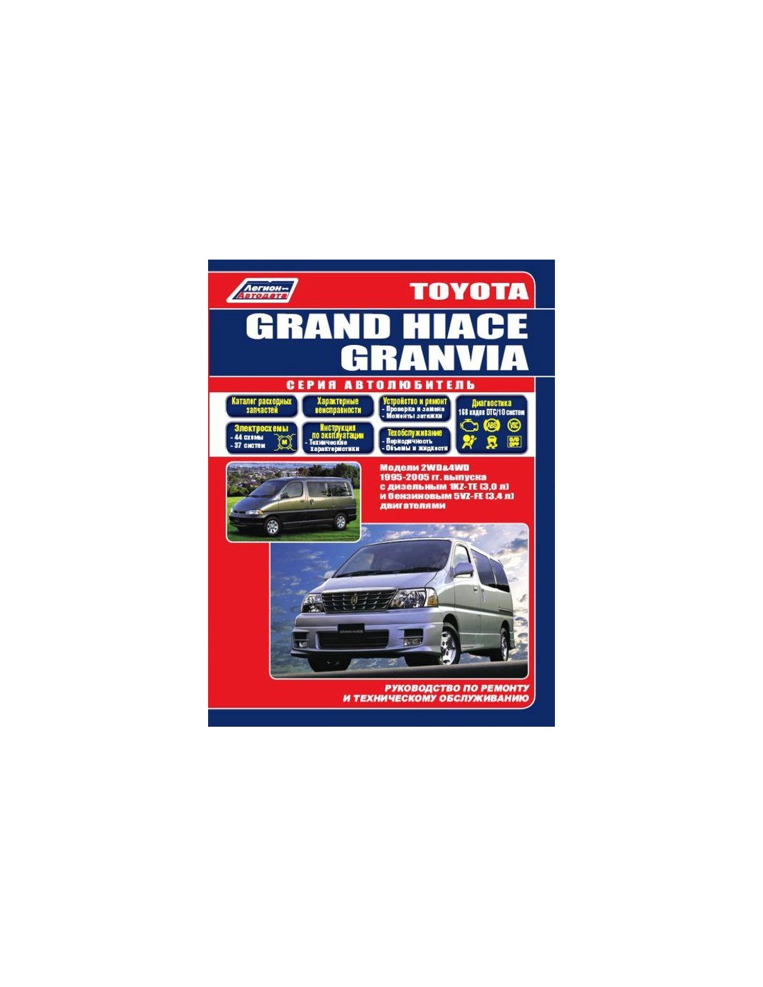 Книга по ремонту Toyota Grand Hiace/Granvia 1995-05г.,содержит руководство по эксплуатации,подробные сведения по техническому обслуживанию автомобиля,диагностике ремонту и регулировке элементов систем двигателя,в том числе электронного управления двигателем,систему смазки и охлаждения,запуска и зарядки,элементов механических и автоматических коробок передач,раздаточной коробки,тормозной системы,включая антиблокировочную систему тормозов,рулевого управления,подвески,кузовных элементов, систем кондиционирования и вентиляции.