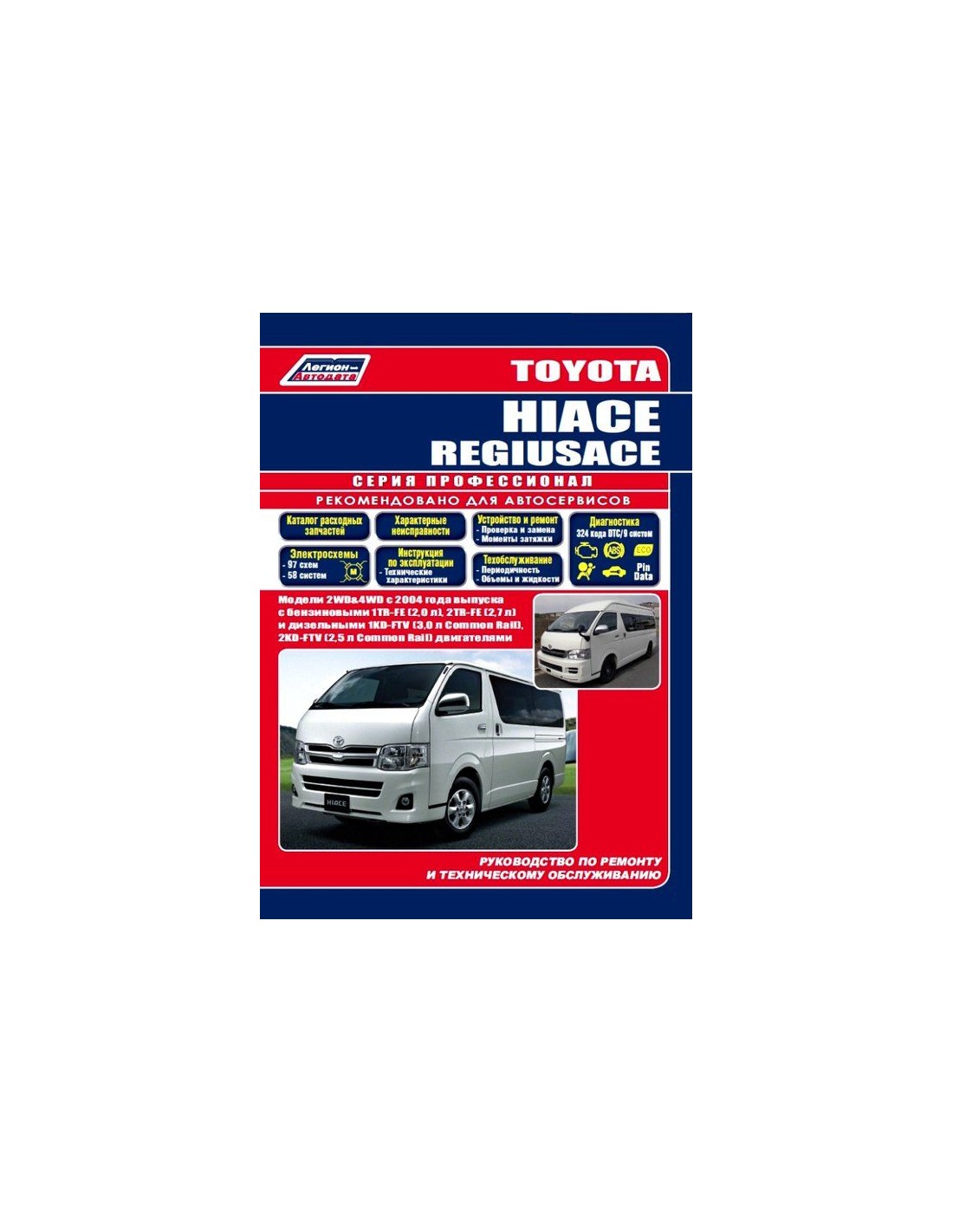 Устройство автомобиля,возможные неисправности и методы их устранения, сопрягаемые размеры основных деталей и пределы их допустимого износа,рекомендуемое смазочные материалы,рабочие жидкости и каталожные номера расходных запчастей,необходимых для технического обслуживания,размеры рекомендуемых и допускаемых шин и дисков-все это можно найти на страницах издания "Легион-Автодата" Книга автомобильная на Toyota Hiace/Regiusace с 2004 г.