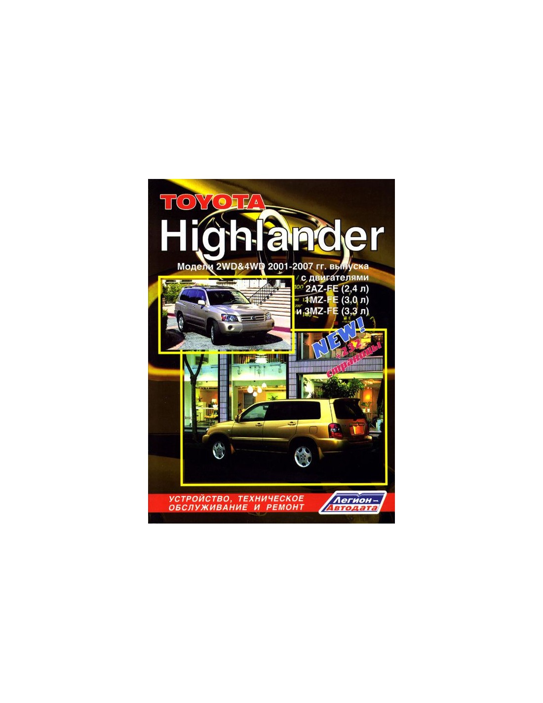 Устройство автомобиля,возможные неисправности и методы их устранения, сопрягаемые размеры основных деталей и пределы их допустимого износа,рекомендуемое смазочные материалы,рабочие жидкости и каталожные номера расходных запчастей,необходимых для технического обслуживания,размеры рекомендуемых и допускаемых шин и дисков-все это можно найти на страницах издания "Легион-Автодата" Книга автомобильная на Toyota Highlander 2001-07 г.