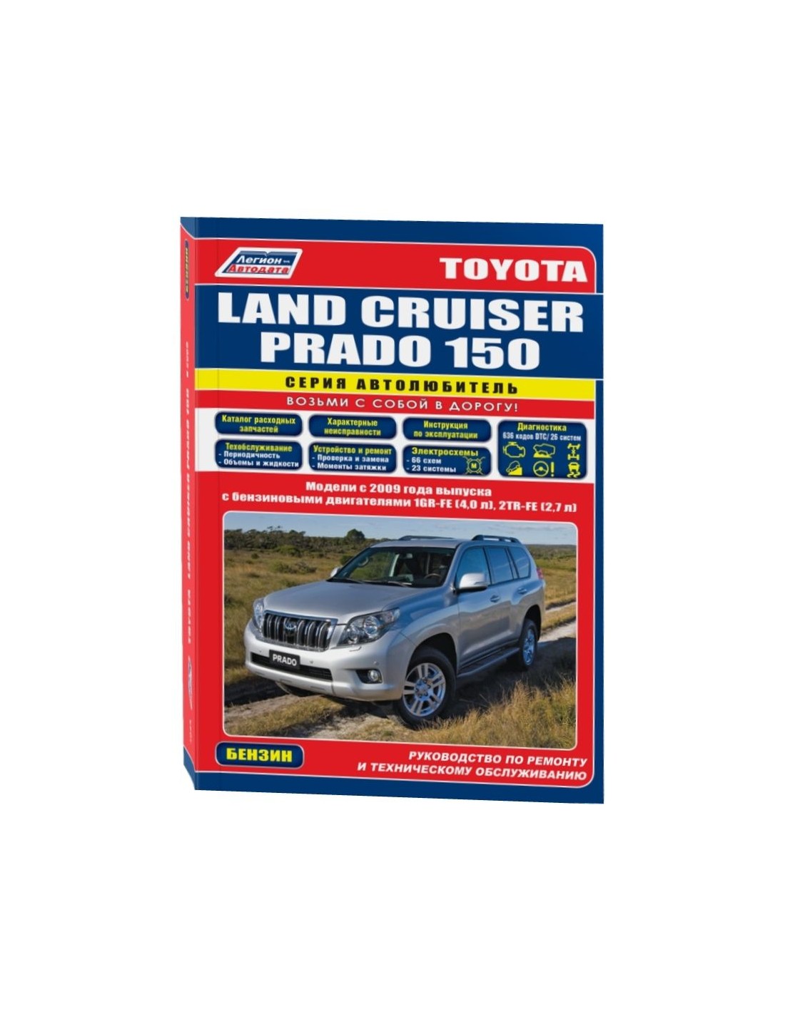 Книга по ремонту Toyota Land Cruiser Prado 150 с 2009 г.,содержит руководство по эксплуатации,подробные сведения по техническому обслуживанию автомобиля,диагностике ремонту и регулировке элементов систем двигателя,в том числе электронного управления двигателем,систему смазки и охлаждения,запуска и зарядки,элементов механических и автоматических коробок передач,раздаточной коробки,тормозной системы,включая антиблокировочную систему тормозов,рулевого управления,подвески,кузовных элементов, систем кондиционирования и вентиляции.