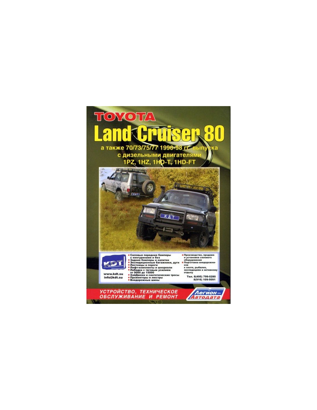 Книга по ремонту Toyota Land Cruiser 80 1990-98 г.,содержит руководство по эксплуатации,подробные сведения по техническому обслуживанию автомобиля,диагностике ремонту и регулировке элементов систем двигателя,в том числе электронного управления двигателем,систему смазки и охлаждения,запуска и зарядки,элементов механических и автоматических коробок передач,раздаточной коробки,тормозной системы,включая антиблокировочную систему тормозов,рулевого управления,подвески,кузовных элементов, систем кондиционирования и вентиляции.