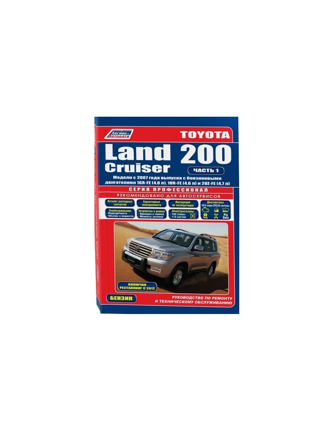 Книга по ремонту Toyota Land Cruiser 200 с 2007 г.,содержит руководство по эксплуатации,подробные сведения по техническому обслуживанию автомобиля,диагностике ремонту и регулировке элементов систем двигателя,в том числе электронного управления двигателем,систему смазки и охлаждения,запуска и зарядки,элементов механических и автоматических коробок передач,раздаточной коробки,тормозной системы,включая антиблокировочную систему тормозов,рулевого управления,подвески,кузовных элементов, систем кондиционирования и вентиляции.