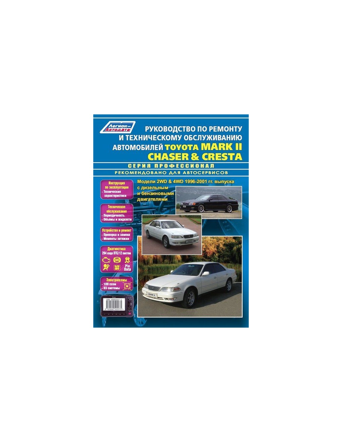 Книга по ремонту Toyota Mark II/Chaser/Cresta 1996-01 г.,содержит руководство по эксплуатации,подробные сведения по техническому обслуживанию автомобиля,диагностике ремонту и регулировке элементов систем двигателя,в том числе электронного управления двигателем,систему смазки и охлаждения,запуска и зарядки,элементов механических и автоматических коробок передач,раздаточной коробки,тормозной системы,включая антиблокировочную систему тормозов,рулевого управления,подвески,кузовных элементов, систем кондиционирования и вентиляции.