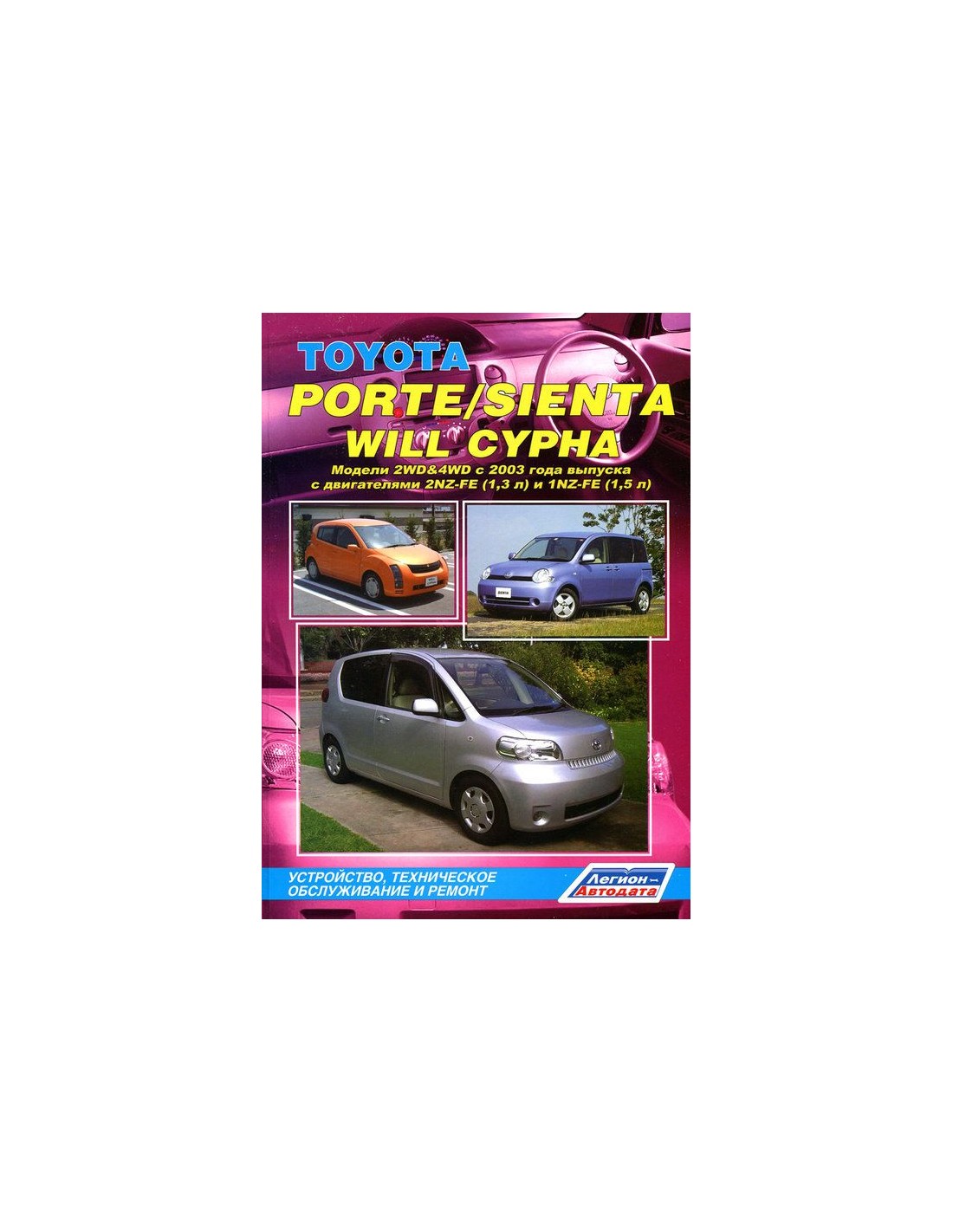 Устройство автомобиля,возможные неисправности и методы их устранения, сопрягаемые размеры основных деталей и пределы их допустимого износа,рекомендуемое смазочные материалы,рабочие жидкости и каталожные номера расходных запчастей,необходимых для технического обслуживания,размеры рекомендуемых и допускаемых шин и дисков-все это можно найти на страницах издания "Легион-Автодата" Книга автомобильная на Toyota Porte/Sienta/Will Cypha с 2003 г.