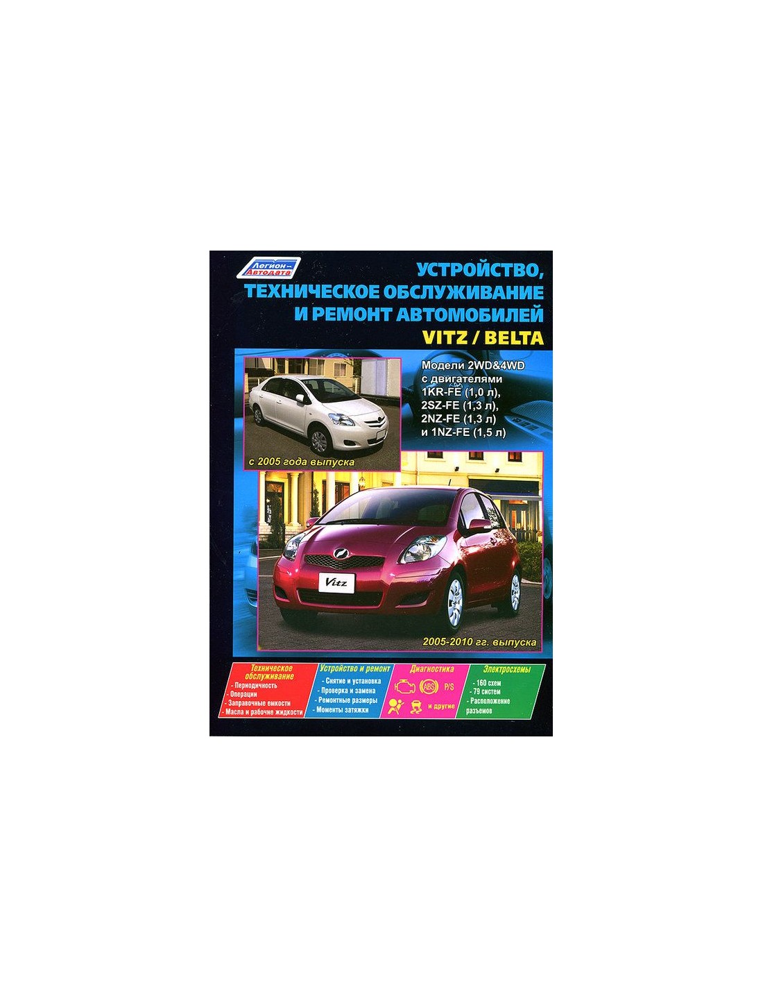 Книга по ремонту Toyota Vitz / Belta 2005-12 г.,содержит руководство по эксплуатации,подробные сведения по техническому обслуживанию автомобиля,диагностике ремонту и регулировке элементов систем двигателя,в том числе электронного управления двигателем,систему смазки и охлаждения,запуска и зарядки,элементов механических и автоматических коробок передач,раздаточной коробки,тормозной системы,включая антиблокировочную систему тормозов,рулевого управления,подвески,кузовных элементов, систем кондиционирования и вентиляции.