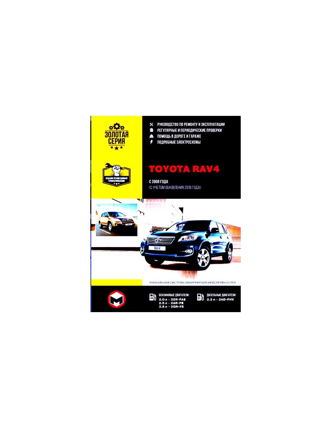 Книга по ремонту Toyota RAV 4 с 2008г ,содержит руководство по эксплуатации,подробные сведения по техническому обслуживанию автомобиля,диагностике ремонту и регулировке элементов систем двигателя,в том числе электронного управления двигателем,систему смазки и охлаждения,запуска и зарядки,элементов механических и автоматических коробок передач,раздаточной коробки,тормозной системы,включая антиблокировочную систему тормозов,рулевого управления,подвески,кузовных элементов, систем кондиционирования и вентиляции.