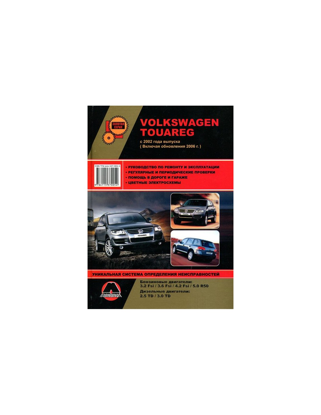 Книга по ремонту Volkswagen Touareg (с 2002 / c 2006) ,содержит руководство по эксплуатации,подробные сведения по техническому обслуживанию автомобиля,диагностике ремонту и регулировке элементов систем двигателя,в том числе электронного управления двигателем,систему смазки и охлаждения,запуска и зарядки,элементов механических и автоматических коробок передач,раздаточной коробки,тормозной системы,включая антиблокировочную систему тормозов,рулевого управления,подвески,кузовных элементов, систем кондиционирования и вентиляции.